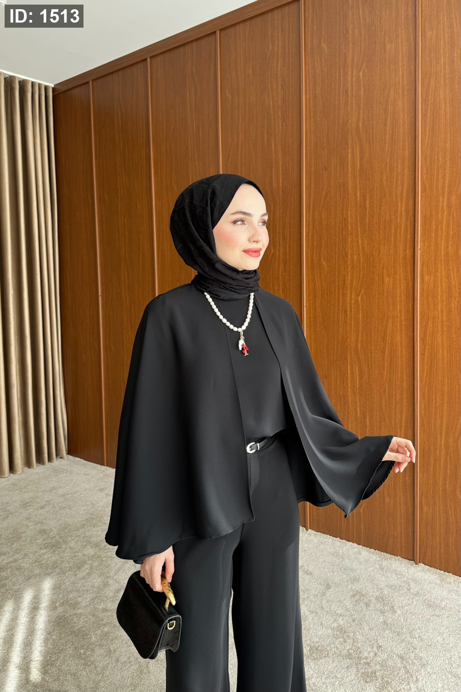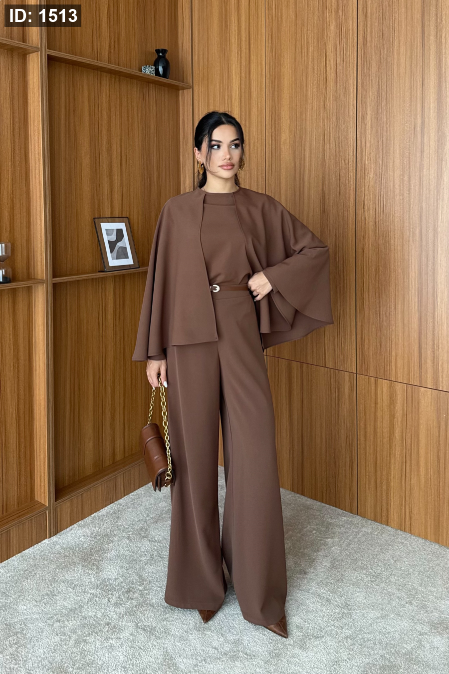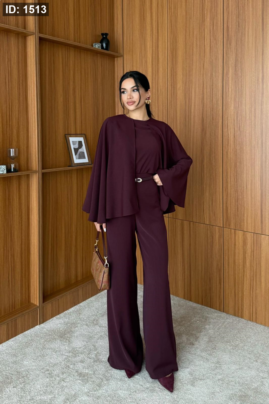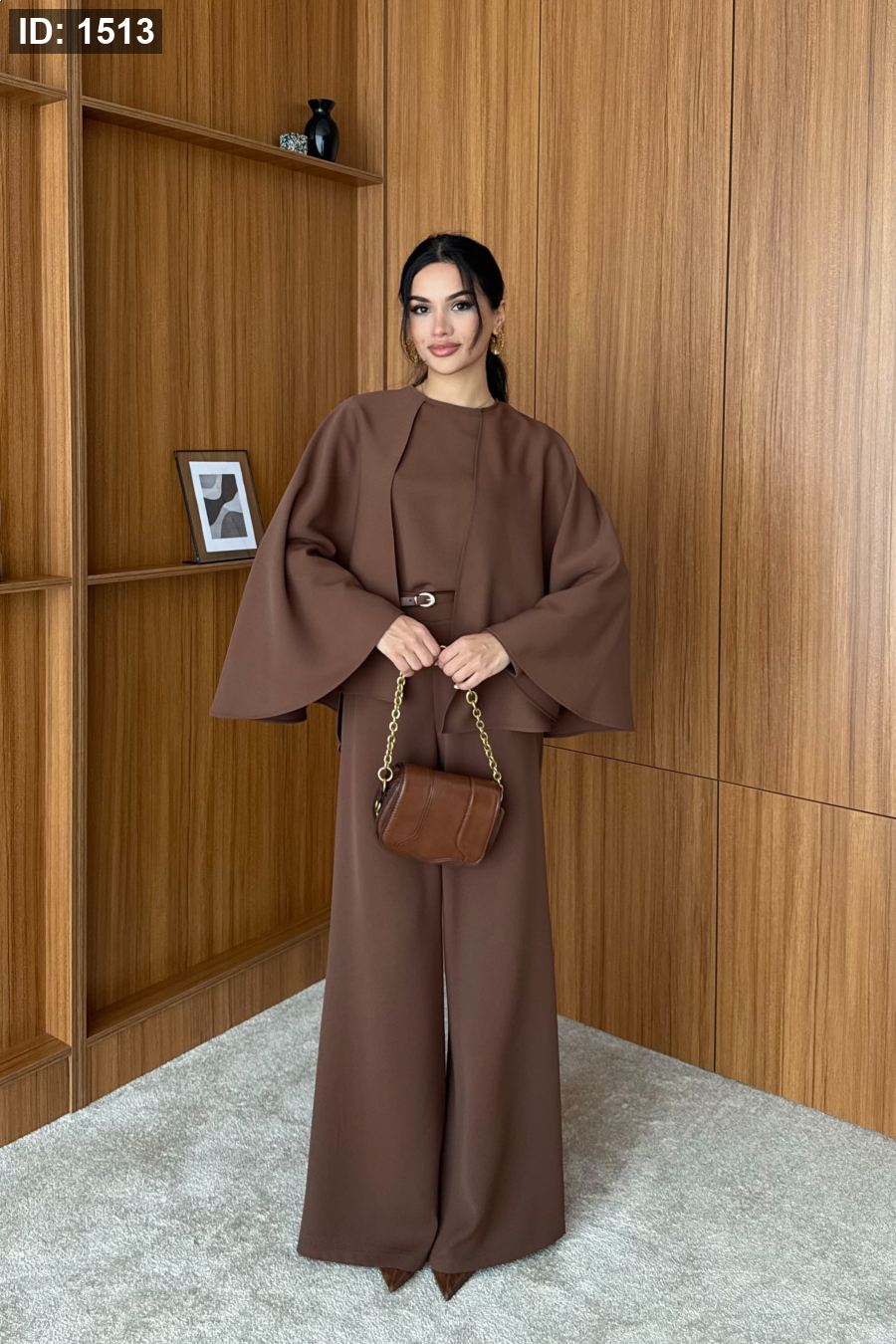 يتميز بتصميم يشبه الكاب. يتضمن حزامًا. البنطال مزود بخصر مطاطي. يبلغ طول الجزء العلوي 66 سم من الأمام و74 سم من الخلف، بينما يبلغ طول البنطال 112 سم. يبلغ طول العارضة 168 سم، ووزنها 57 كجم، وقد اختارت المقاس S.